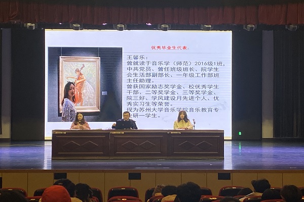 在通报会上,辅导员首先用数据呈现了2020届毕业生当前的就业数据。其次对音乐学、音乐表演和舞蹈学三个专业毕业生的就业方向进行了分析,最后还就老员工创业政策进行了解读。充实的数据和详实的案例让大一同学充分认识到职业生涯设计的重要性,纷纷表示要居安思危,勤勉学习。