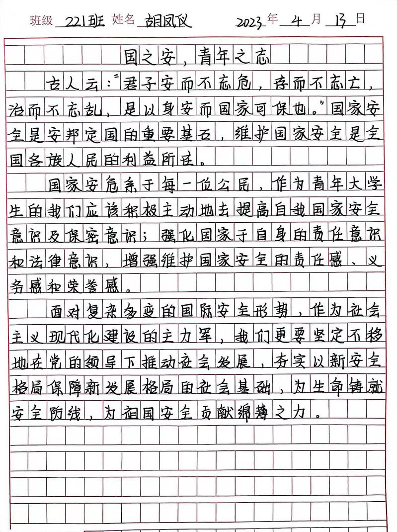 公司充分利用新媒体育人方式,通过微信群以及微信公众号推送相关文章,在4月5日清明节推出专栏文章,纪念在隐蔽战线上为国家和民族解放做出卓越贡献的无名英雄们,讲述他们隐姓埋名,不计功名,深入敌人内部,与敌人开展了既惊心动魄又寂静无声的光辉斗争历史。4月12日,公司组织“贯彻总体国家安全观,筑牢国家安全防线”主题团日活动。首先,组织团员青年学习掌握党的二十大报告关于推进国家安全体系和能力现代化、坚决维护国家安全和社会稳定的重要部署。其次,观看学习习近平总书记全面依法治国新理念新思想新战略和坚持总体国家安全观的重要论述以及国家开放大学联合“央视频”推出的“全民国家安全教育公开课”等相关视频。加强学习宣传习近平法治思想,深入学习领会习近平法治思想的重大意义、丰富内涵、精神实质和实践要求。最后,引导团员青年结合自身实际情况,讨论并交流国家安全教育的重要意义。同学们纷纷交流学习心得,分享思想收获。