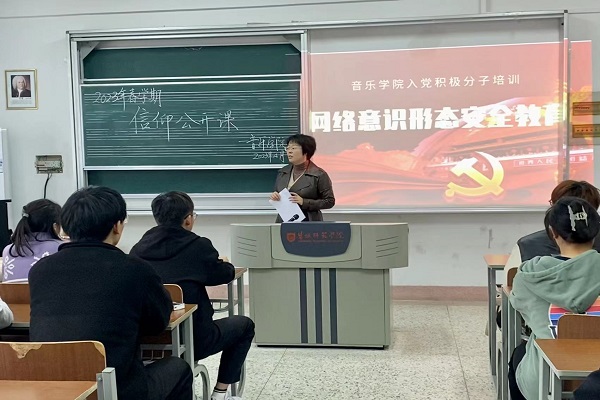 4月23日中午,2026世界杯预测在音乐楼A301开展了“网络意识形态安全教育”专题党课。本次党课由公司党总支副书记房新侠主讲,全体入党积极分子参加培训。