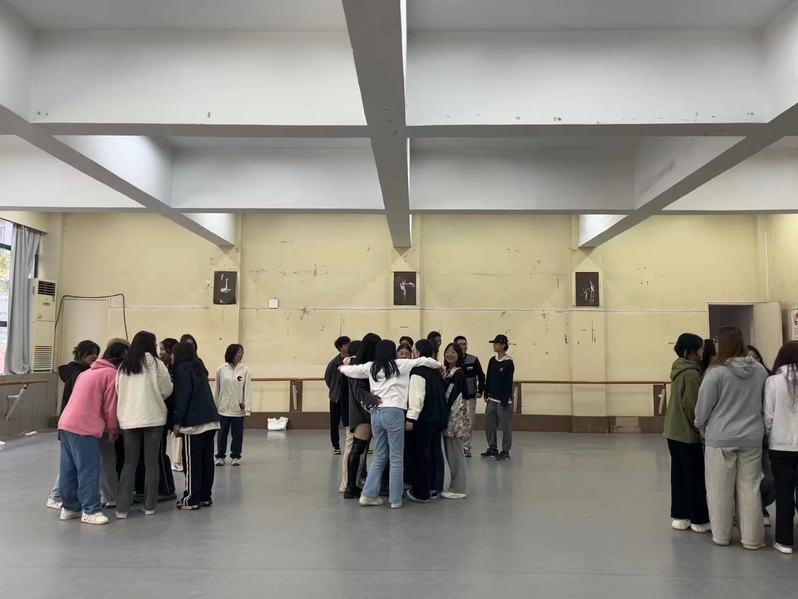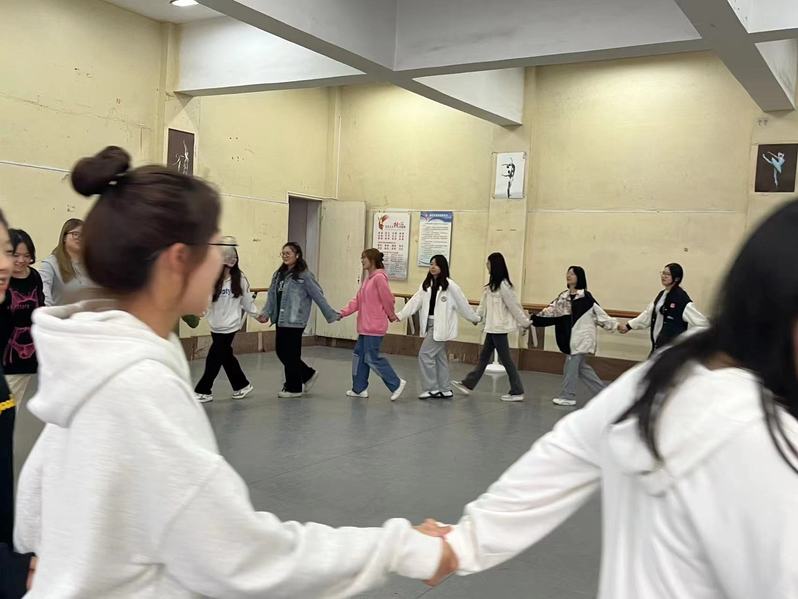 氛围感get!本次活动的“热身运动”为放松身心的揉捏操,在心理委员的组织下,同学们围成了圈,跟着心理委员的节拍口令,大家先给自己揪耳、按耳、敲头,慢慢舒缓了紧张的情绪,随后大家齐向右转,后面的同学对前面的同学按摩,一轮过后转换方向又进行了一次……一阵舒服的捏肩拍背后,前面背按摩的同学像刚刚为自己提供服务的同学致以了真诚的感谢。热身结束后,舞蹈室的氛围逐渐活跃起来了,大家都在热身活动中放松了心情。