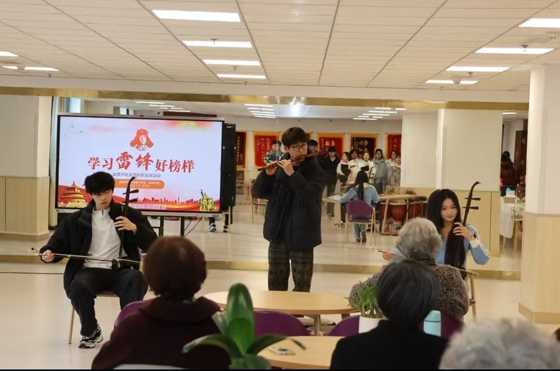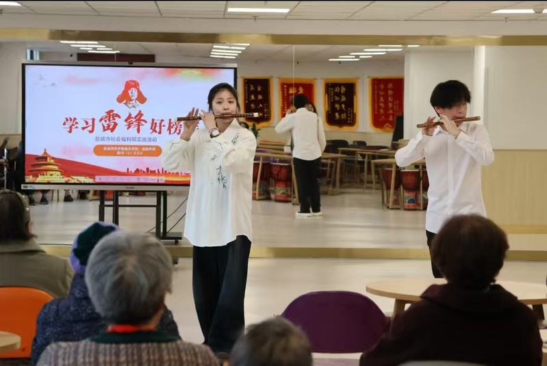 3月18日,班主任陈嘉禾老师又带领同学们走进盐城市社会福利院,为老人们献上了一场精心筹备的慰问演出。激昂的合唱《学习雷锋好榜样》拉开演出序幕,熟悉的旋律瞬间点燃全场,许多老人情不自禁地跟着哼唱。随后,同学们轮番登台,献上精彩节目:二胡独奏《赛马》激昂奔放,精湛技艺赢得阵阵喝彩;竹笛合奏《扬鞭催马运粮忙》清脆悠扬,欢快的旋律仿佛将观众带入丰收的田野;歌曲独唱《花非花》婉转深情,令人陶醉;合奏《八月桂花遍地开》热烈欢快,传递着节日的喜庆;舞蹈《最炫民族风》活力四射,动感的节拍引得老人们轻轻摆动身体,脸上洋溢着幸福的笑容。演出尾声,全体同学与老人们共同唱响《我和我的祖国》,老少同心,歌声嘹亮,温暖在每个人心间流淌。
