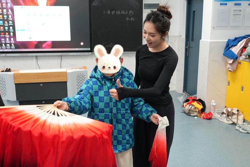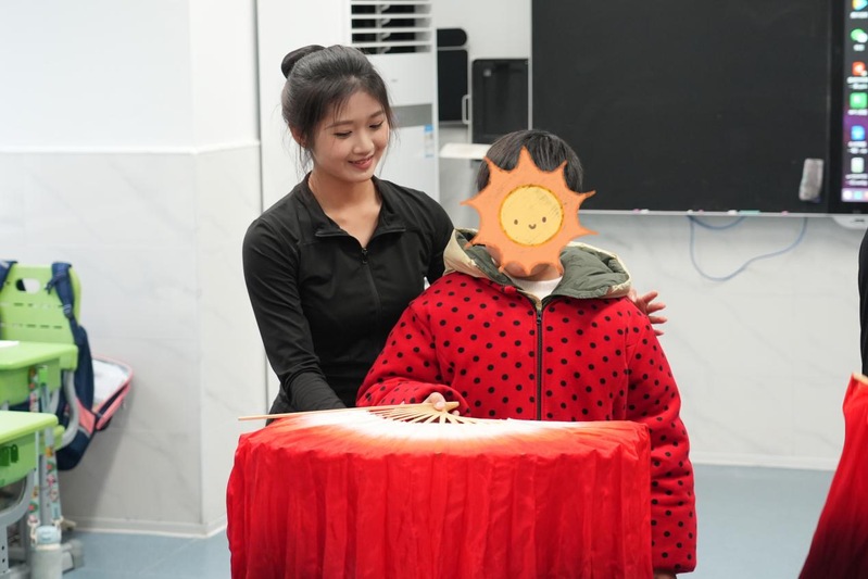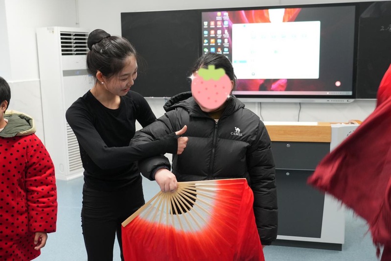 活动伊始,舞蹈专业的志愿者为孩子们带来了扇子舞《溯跃》的精彩表演。舞者们手持彩扇,动作刚柔并济,以富有张力的肢体语言展现了顽强拼搏、奋发向上的精神风貌。尽管孩子们无法听到音乐的节奏,但志愿者们用饱满的情感和流畅的舞姿,传递出舞蹈所蕴含的力量与美感,赢得了孩子们的专注与掌声。